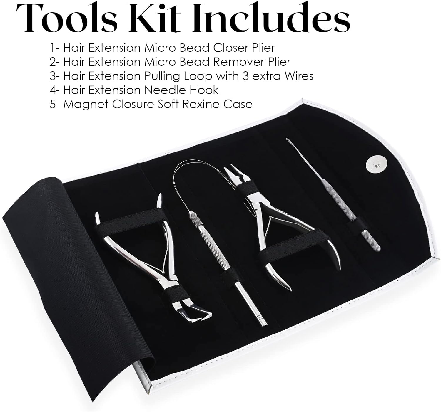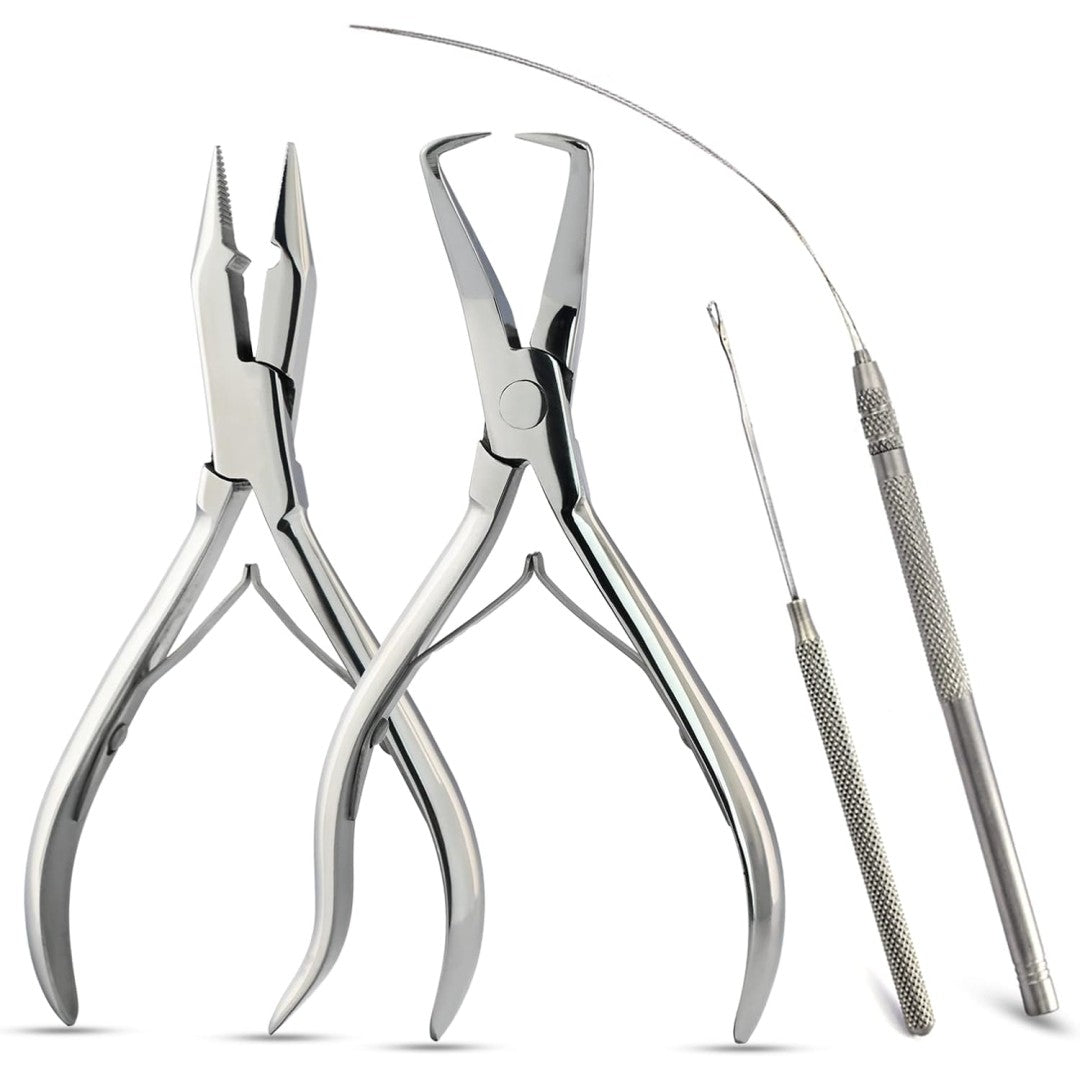 - All-in-One Professional Hair Extension Kit: Complete hair extension tool kit including Microbead Closer Plier, Hair Extension Remover Pliers, Loop Needle Threader, Hair Pulling Hook, and 3 extra replaceable loop wires. Designed for I-Tip, Micro link, Nano, Copper Rings, and Feather Extensions.