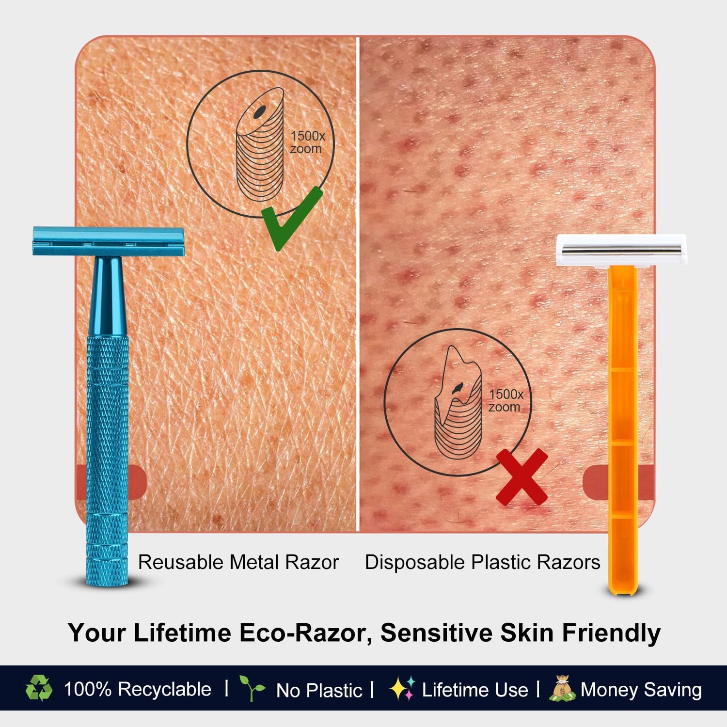 • Eco-Conscious & Built to Last: Shaving with our reusable metal safety razor - a zero-waste essential for eco-friendly shaving. Crafted from long-lasting, fully recyclable metal, this vintage-inspired double edge razor saves money and reduces environmental impact. With the right care and maintenance, it can last a life, aligning with sustainable lifestyles. (No parts to replace, just replace standard safety razor blades) Change the way you shave, choose our single blade razors for men and women