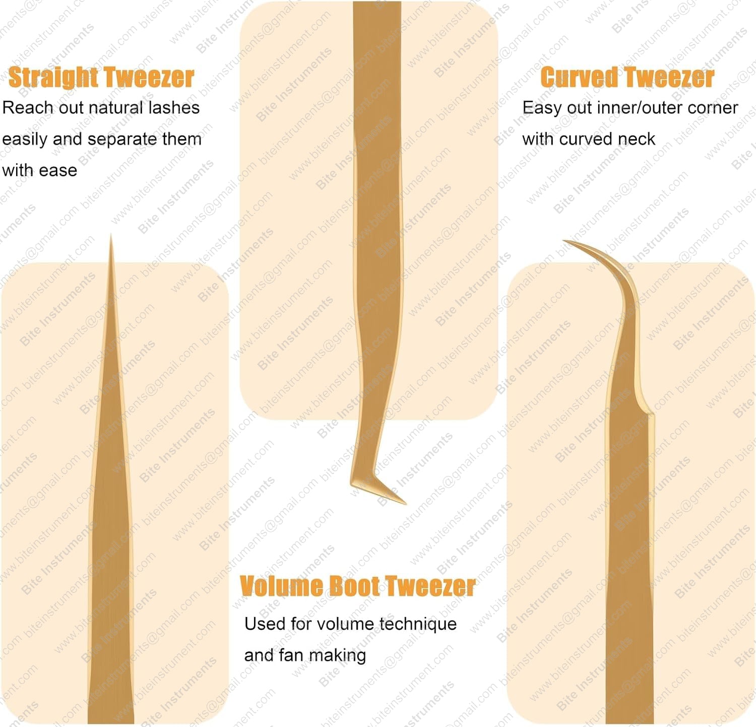 - Lash Extension Tweezer Set: 3 PCS high-precision tweezers for professional lash artist, contains: 1* Straight tweezer, 1* Curved Tweezers, 1* Volume Boot tweezer